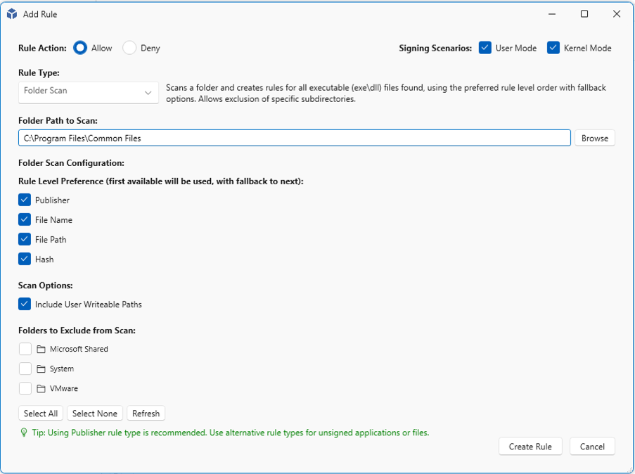 Add Rule provides a familiar, wizard-driven interface aligned with the Microsoft App Control experience, making it easy for administrators to create new execution exceptions. Instead of learning a new workflow, IT teams can define rule sets using the same concepts and steps they already know, reducing errors and speeding up daily operations.