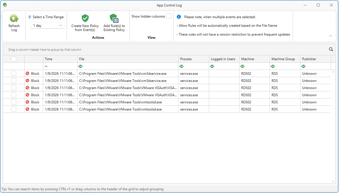 Quickly search and filter App Control events to pinpoint blocked applications and policy behavior.