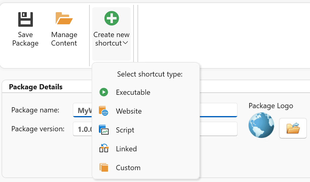 Simply create a new package and select “Create new shortcut” to configure the target. Shortcuts can start executables with or without arguments, whether they are included inside the package or located externally on the system.